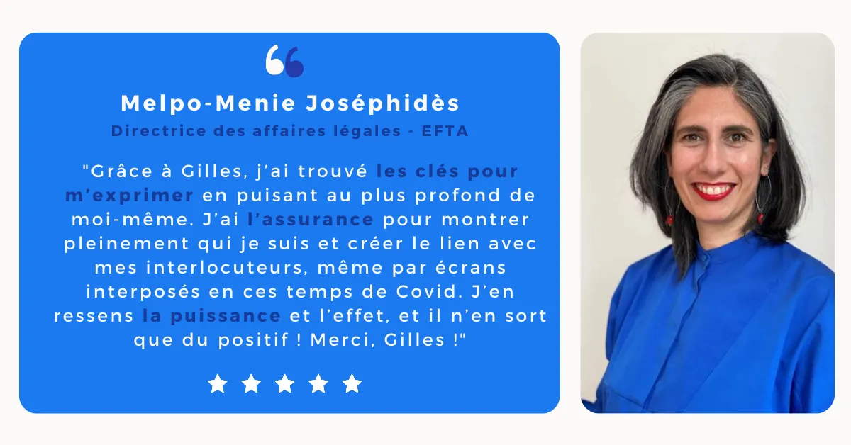 Depuis plus de 20 ans, Gilles accompagne des dirigeants de grandes entreprises et organisations internationales, des avocats, des scientifiques, des financiers, des ONG, etc... dans l'exercice passionnant et périlleux de la prise de parole en public.