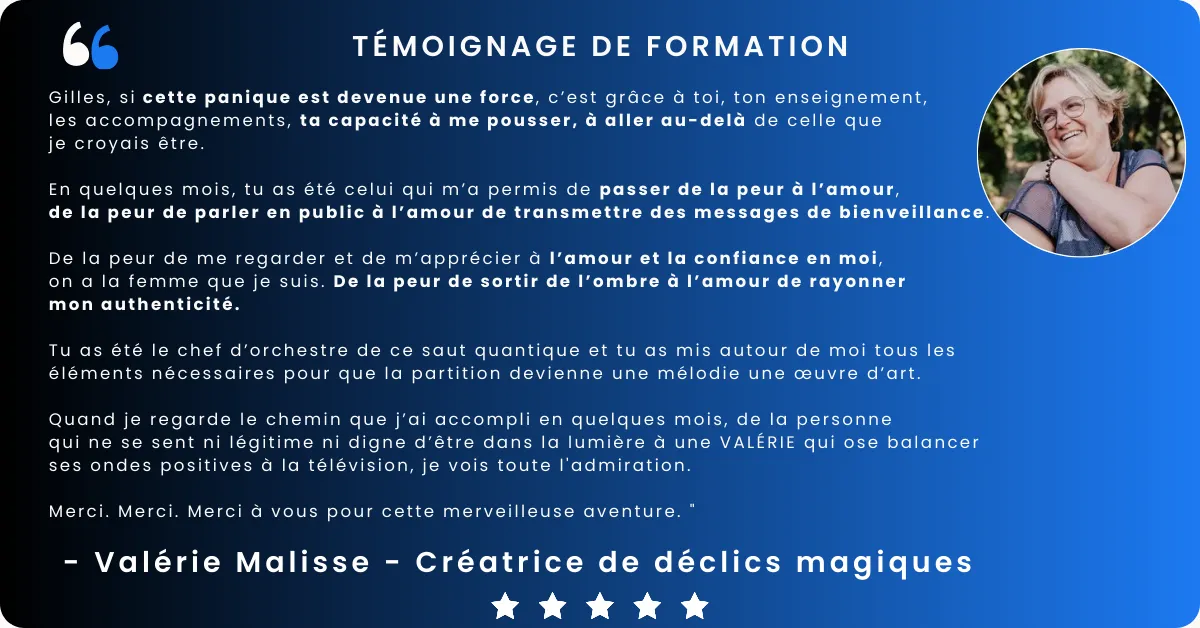 Le trac est normal, mais il peut être apprivoisé. "Le Grand Déclic©" propose des techniques pour transformer cette anxiété en énergie positive. Avec des exercices progressifs et des sessions de coaching, vous apprendrez à vous sentir en sécurité face à votre audience et à exprimer votre message avec sérénité.
