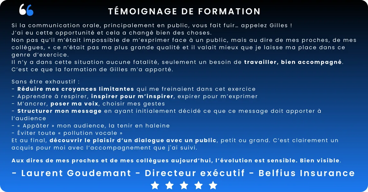 La voix de la réussite : 2 jours complets de séminaire en présentiel à Bruxelles* (dates à confirmer) en immersion totale avec Gilles pendant 2 jours intenses pour accompagner en profondeur la transformation de vos talents d'orateur.